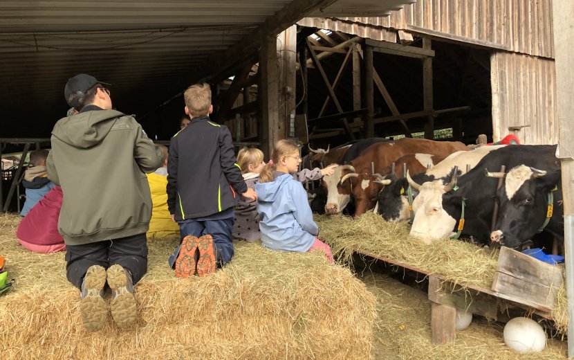 Wir sind auf einen Bauernhof gegangen. Wir haben im Heustock gegessen. Wir haben eine Hofführung gemacht, ein Brot gegessen und Punsch getrunken. Wir haben die Kuh genau angeschaut und die Kühe gestreichelt.