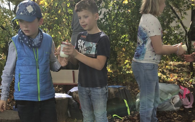 Die Draußenschule Arnach findet, wie der Name schon sagt, draußen statt. Im vergangenen Herbst stand das Projekt Bauernhof auf dem Programm. So besuchte die Klasse einen Bauernhof in Arnach, außerdem den Dorfmarkt und zusammen produzierten die Kinder Butter, die sie im Anschluss natürlich auch probierten. Hier berichten die Kinder selbst von ihren Eindrücken.