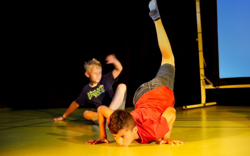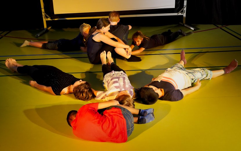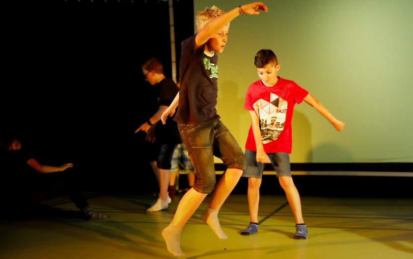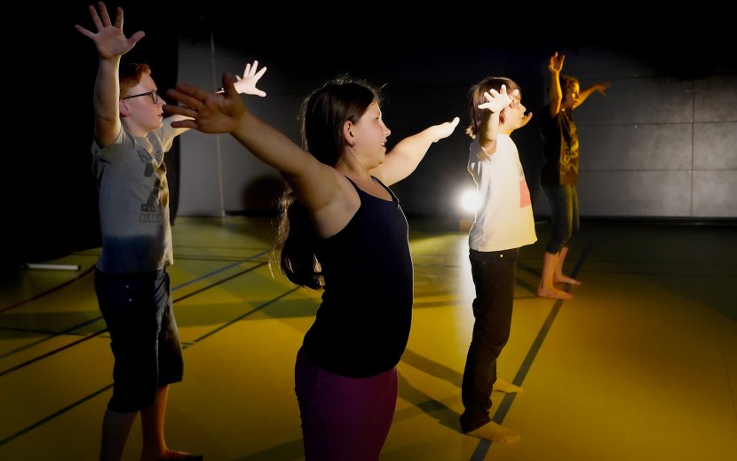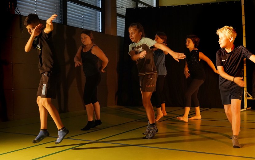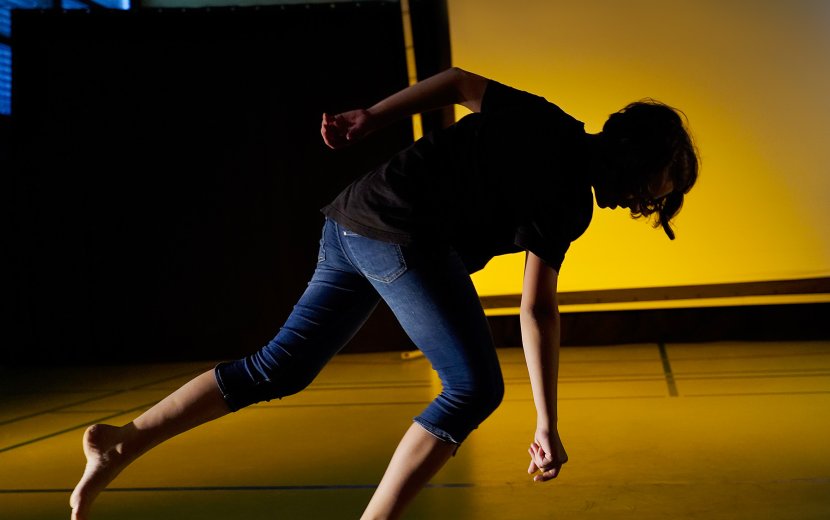 Mit einer Werkstattaufführung geben die jungen Tänzerinnen und Tänzer Einblicke in ihren Schaffensprozess. Leuchtend gelbe Plakate schmücken die Schulflure. Zuschauerinnen und Zuschauer, große wie kleine, strömen neugierig in die Turnhalle der Schule. Freudige Gesichter, gespannte Blicke in Richtung Bühne: eine große, frei stehende Leinwand, dahinter ein schwarzer Vorhang und viel freie Fläche für Tanz und Kunst.