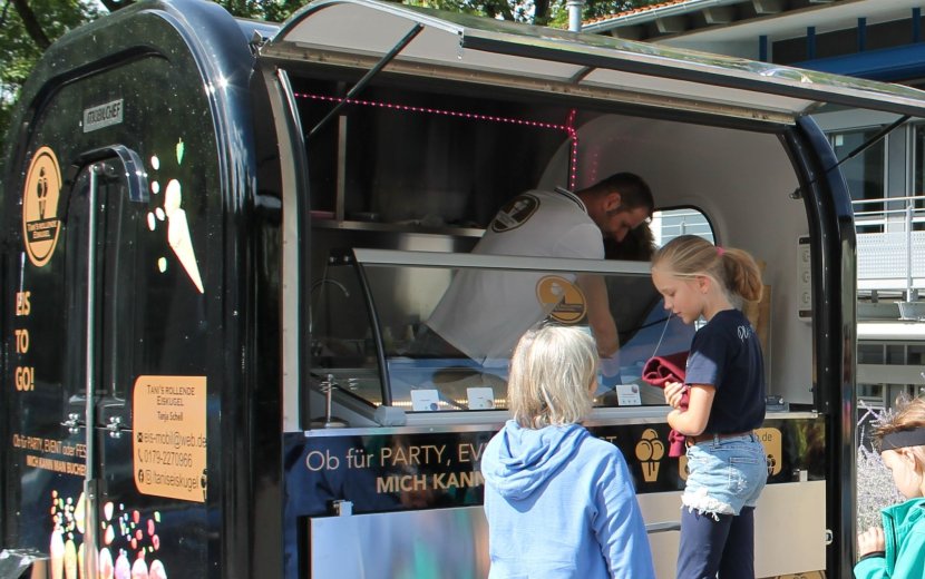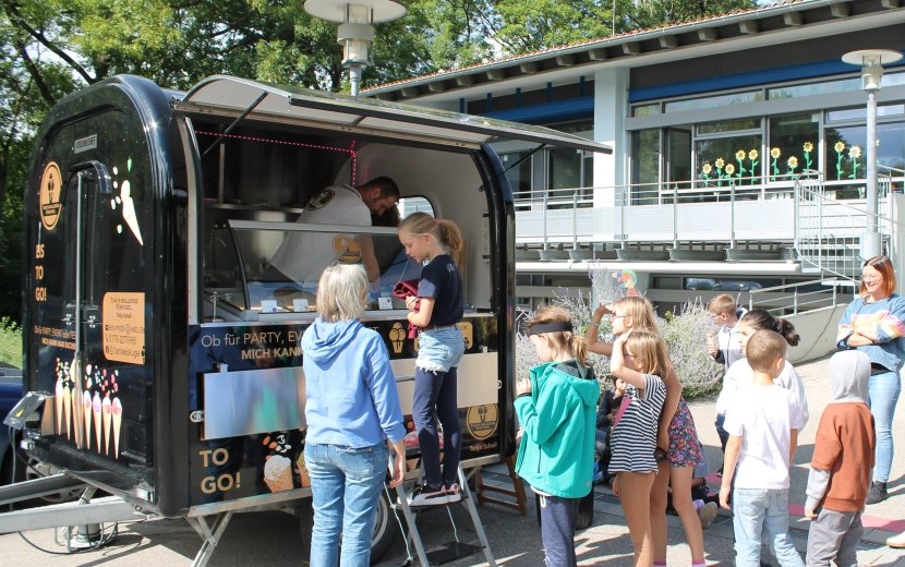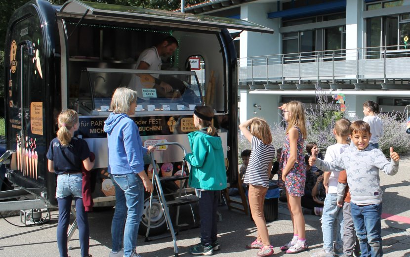 Dazu eingeladen hatte das Team der Sprachheilschule Biberach. Und so gab es für alle Schülerinnen und Schüler der Sprachheilschule, für die Kinder des Sprachheilkindergartens, die Schülerinnen und Schüler des benachbarten Horts und der Betreuung der Birkendorf-Grundschule an einem sonnigen Tag Ende September ein leckeres Eis. Auch die Mitarbeiterschaft durfte sich mit Eis versorgen. Und damit auch die Kleinen eigenständig bei Tani´s rollender Eiskugel bestellen konnten, sorgte eine Trittleiter für die richtige Bestellhöhe - abgesichert durch Schulleiterin Annette Koczy. Im Anschluss ließen sich die Kinder das Eis auf dem Boden und auf dem Klettergerüst schmecken. "Von der Nachbargrundschule gab es am nächsten Tag eine Riesenpackung Schokolade mit einem Dankeschön-Bild", erzählt Annette Koczy strahlend.