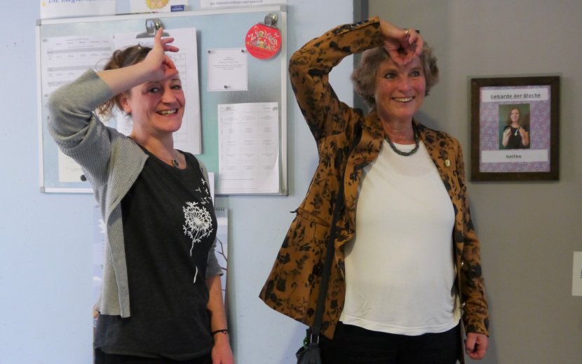Auf dem weiteren Rundgang durch die Schule lernte Bogner-Unden von Schulleiterin Alexandra Hoffmann die Gebärde der letzten Woche - „keine Ahnung“ - und die Gebärde der aktuellen Woche - „helfen“. Sie sah sich den Therapieraum an, den Bewegungsraum und die Klassenzimmer. Sie lernte die Funktionsweise der Tafeln kennen, die eine Mischung aus Kreidetafel und digitaler Tafel sind und betrachtete im Speisesaal die sogenannten Akustiksegel, die an der Decke montiert sind und dafür sorgen, dass viel Schall geschluckt wird. „Es ist toll, was Sie machen“, lobte Bogner-Unden das fünfzehnköpfige Team. Dieses unterstützt sowohl an der Schule, als auch an Schulen und Kindergärten im ganzen Landkreis Kinder mit Sprach- und Hörproblemen durch den Sonderpädagogischen Dienst oder in ambulanten Sprachheilkursen. Im Moment sei das Team komplett, erklärte Hoffmann, aber im nächsten Jahr würde eine Kollegin ins Referendariat gehen und zum Ende des Schuljahres gingen zwei Lehrkräfte in Rente. Im Idealfall könne sie die Stellen mit Sonderpädagoginnen und Sonderpädagogen aus den Fachbereichen „Sprache“ oder „Hören“ wiederbesetzen. „Aber wir haben auch sehr gute Erfahrungen mit Quereinsteigern“, erzählt Hoffmann. Nur scheiterten Quereinstiege oft an den Mühlen der Bürokratie des Schulamtes. Spontan sagte Bogner-Unden in dieser Sache ihre Unterstützung zu: „Wenn Sie jemanden wollen und nicht kriegen, sagen Sie mir Bescheid!“, forderte sie die Schulleiterin auf.