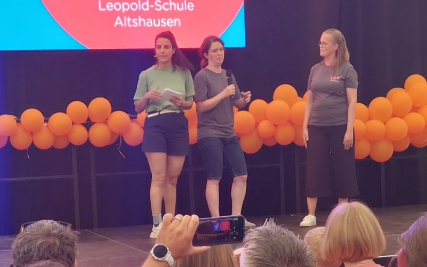 Zum Abschluss zeigten die beiden noch einen Ausschnitt von einem Lied in Gebärdensprache, das Lied „Feuerwerk“ von Vincent Weiss. Immerhin gebe es bereits einige Lieder in Gebärdensprache, damit auch Gehörlose mehr vom Inhalt der Musik verstehen erzählten sie den Kindern. „Es war eine schöne Erfahrung für uns, auf der Bühne zu stehen und so viele Kinder gleichzeitig zu erreichen“, blickt Nicole Münch zurück. „Den freudigen Applaus der Kinder, natürlich in Gebärdensprache, haben Sarah und ich sehr genossen“, so die Sonderpädagogin.
