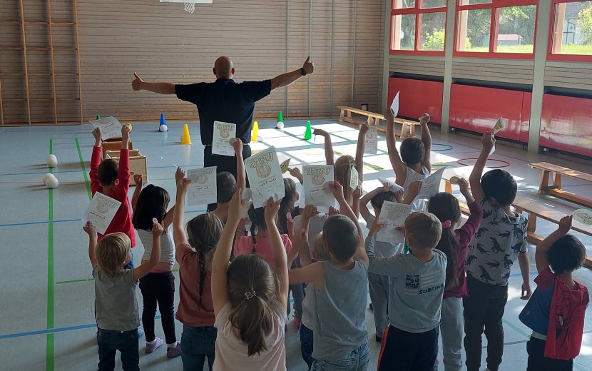 Alle Kids heben stolz ihre Urkunde zum Mini-Sportabzeichen hoch, frisch verliehen von Manuel Steckmann, Stellvertreter für die Württembergische Sportjugend (WSJ). (Foto: Annika Gaficz)