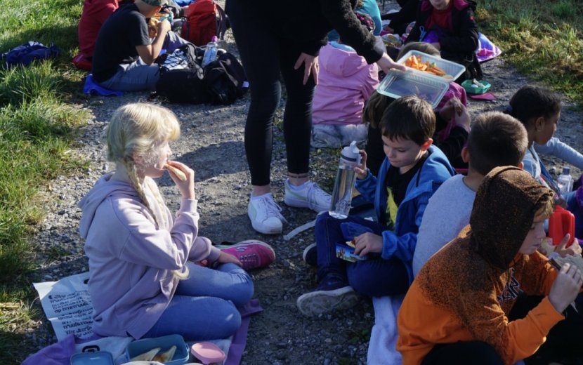 Nach dem ersten Teil der Wanderung legten die Kinder eine wohlverdiente Frühstückspause ein. Jeder hatte sein eigenes Frühstück mitgebracht und genoss die Zeit, um sich zu stärken und die Natur zu erkunden. Dabei entstanden viele fröhliche Gespräche und das Gemeinschaftsgefühl der Schulkinder wurde gestärkt.