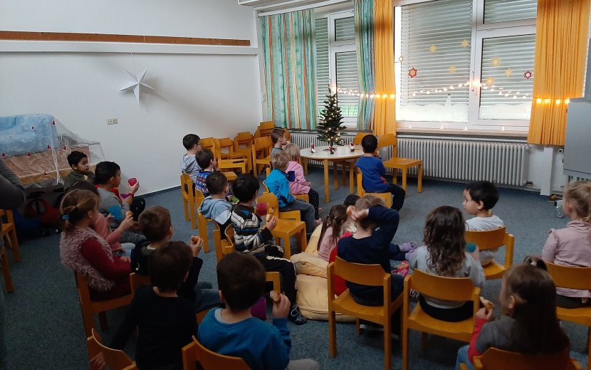 Eigentlich sollte uns der Nikolaus während unserem Waldtag begegnen, jedoch machte uns das Wetter einen Strich durch die Rechnung. Umso schöner war die spontane Umplanung des Tages. Dafür schmückte das Team den Gemeinschaftsraum mit Lichterketten, Tannenbäumchen und funkelnden Sternen. Wir starteten mit einem ausgiebigen Frühstück. Es gab Hefenikoläuse und leckeren Punsch, wir sangen Nikolauslieder und hörten Weihnachtsmusik. Unter einem Vorwand lockten wir die Kinder nach draußen, geschützt unter dem Dach, als auf einmal der Nikolaus mit seinem Gehilfen auf unseren Spielplatz gelaufen kam. Der Moment war selbst für die Erwachsenen gänsehauterregend. Mit Liedern und einem Fingerspiel begrüßten wir unsere Gäste. Anschließend las der Nikolaus Lob und Tadel der Gruppen aus seinem goldenen Buch vor und jedes Kind erhielt ein Geschenk. Gebührend verabschiedeten wir Knecht Ruprecht und den Nikolaus und ließen den Tag mit einem feinen Leberkäswecken und abschließendem Schneemannbauen ausklingen. War das, trotz all den Stolpersteinen doch noch ein zauberhafter Tag!