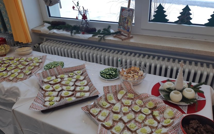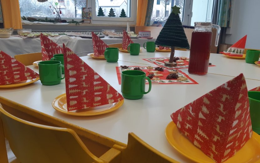 Krankheitsbedingt waren nur sehr wenig Kinder anwesend, darum konnten alle in einem Gruppenraum spielen. Währenddessen richteten die Weihnachtswichtel ein wunderbares Buffet an und dekorierten alles. Es gab selbstgemachten Pudding, Obstsalat, leckere Brote mit Gurkensternen, selbstgebackene Plätzchen und Punsch. Die Überraschung startete mit einer interaktiven Erzählung der Weihnachtsgeschichte, bei der die Kinder dem Jesus-Kind ein kleines Geschenk in die Krippe legen durften. Weiter ging es mit einem gemeinsamen Weihnachtslieder-Singen vor unserem bunt geschmückten Christbaum. Anschließend wurde das Buffet eröffnet und genüsslich geschlemmt. Die Kinder waren sich am Ende des Tages einig: „Die Weihnachtswichtel dürfen gerne jedes Jahr zu uns kommen, das war ein toller Tag!“