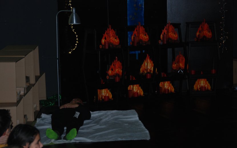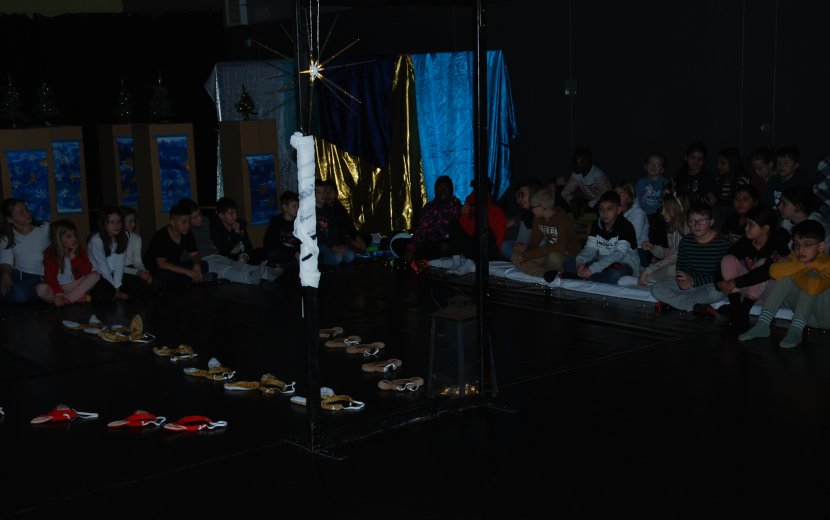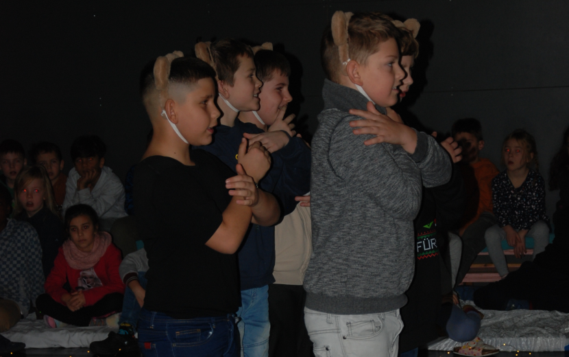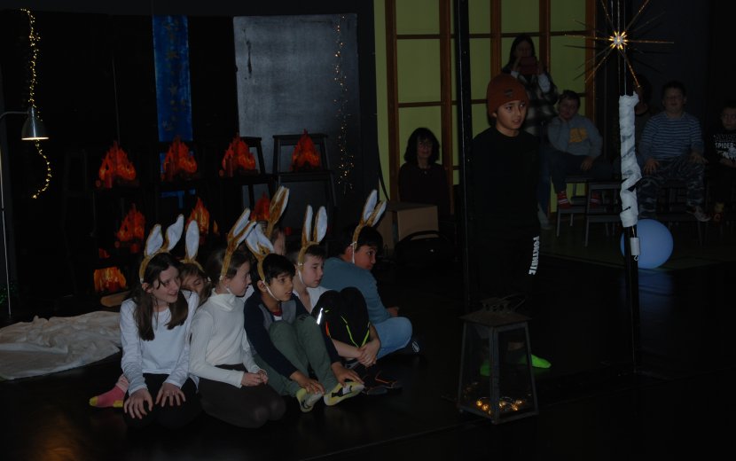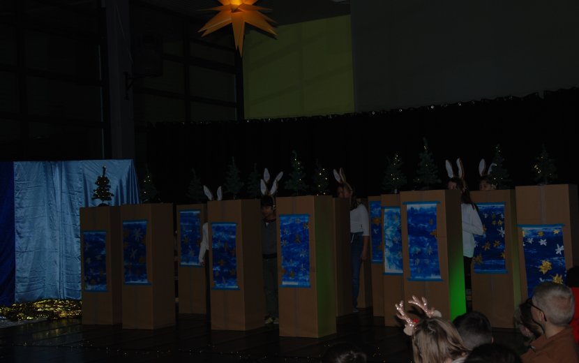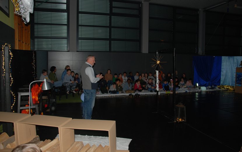 Die 25 Schülerinnen und Schüler der vierten Klassen hatten gemeinsam – in Anlehnung an den Bilderbuchklassiker ‚Es klopft bei Wanja in der Nacht‘ ihr eigenes, kleines Theaterstück erarbeitet und die Turnhalle der Schule am Wolfsbühl zur Geschichte passend umgestaltet. Diese war zauberhaft dekoriert, ließ die Besucher staunen und versetzte alle in eine wunderbar weihnachtliche Stimmung.