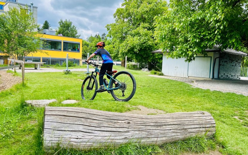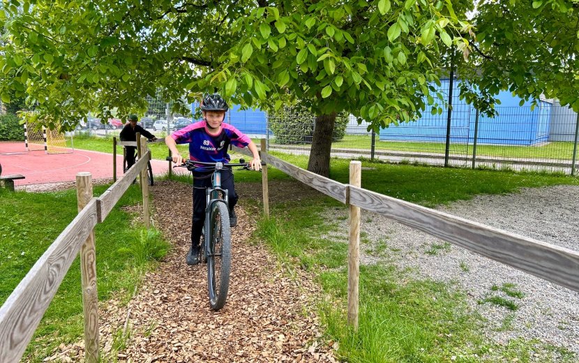 An insgesamt vier Übungsstationen konnten die Schülerinnen und Schüler ihr Können auf dem Fahrrad unter Beweis stellen und verbessern, währenddessen sie von Siebtklässlern und ihren Lehrkräften betreut wurden. Schüler Rene war begeistert: „Station 4 war die Coolste. Mit den Mountainbikes durch das Gelände fahren, hat richtig Spaß gemacht!“ Neben Gleichgewichtsübungen und plötzlichem Abbremsen vor Hindernissen standen Geschicklichkeitsaufgaben auf dem Programm: So fuhren die Kinder langsam unter einer gespannten Wäscheleine hindurch und sollten dabei gezielt eine Wäscheklammer berühren. Eine Geländefahrt mit Holzhindernissen, engen Kurven und Anstiegen rundete das Training ab. Besonders mutige Schülerinnen und Schüler durften die Geländestrecke sogar einhändig meistern.