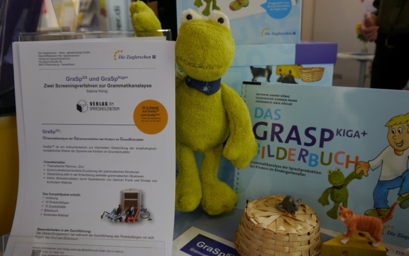 Der Verlag am Sprachheilzentrum sitzt in Ravensburg und gehört zum Hör-Sprachzentrum der Zieglerschen. Er entwickelt und vertreibt seit 50 Jahren eigen produzierte Materialien für die Sprachförderung. Konkret sind das Spiele, Bilder, Bildgeschichten und Bilderbücher zur Diagnose und Therapie der unterschiedlichsten Sprachstörungen. Die Spezialprodukte sind für Kinder im Vor- und Grundschulalter gedacht. Sie werden auf Basis neuester wissenschaftlicher Erkenntnisse und langjähriger praktischer Erfahrung von den Kolleginnen und Kollegen des Hör-Sprachzentrums konzipiert. Über den Verlag werden sie dann hergestellt, vertrieben und nach ganz Europa, manchmal sogar bis nach Australien, versandt. »Wir sind sehr zufrieden mit der Resonanz auf der didacta«, zieht Anna Möhrle, Leiterin des Verlages, Bilanz. Besonders oft sei man auf die Grammatikanalyse »GraSp« und die »tollen Illustrationen« angesprochen worden. »Nun hoffen wir auch auf viele neue Bestellungen«, so Anna Möhrle. »Am besten über unseren Online-Shop.«