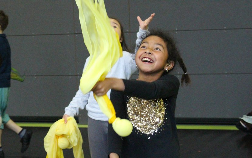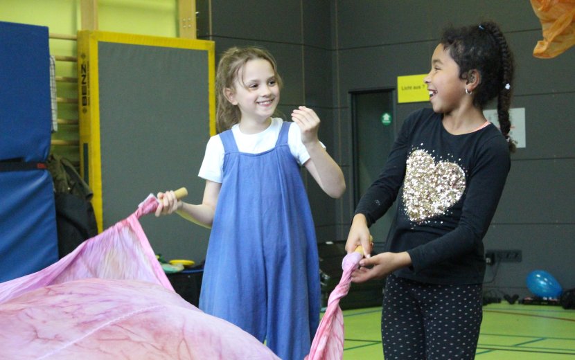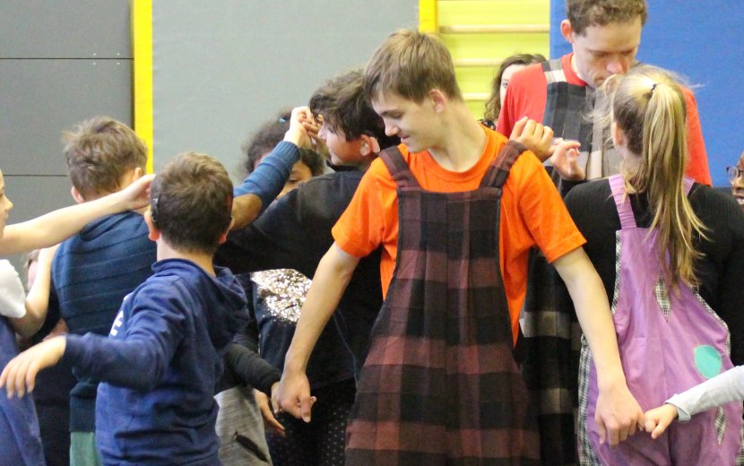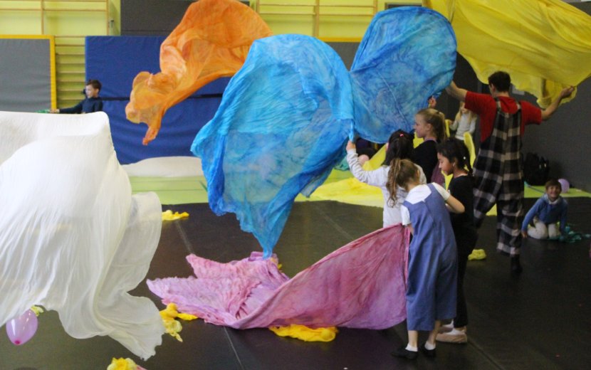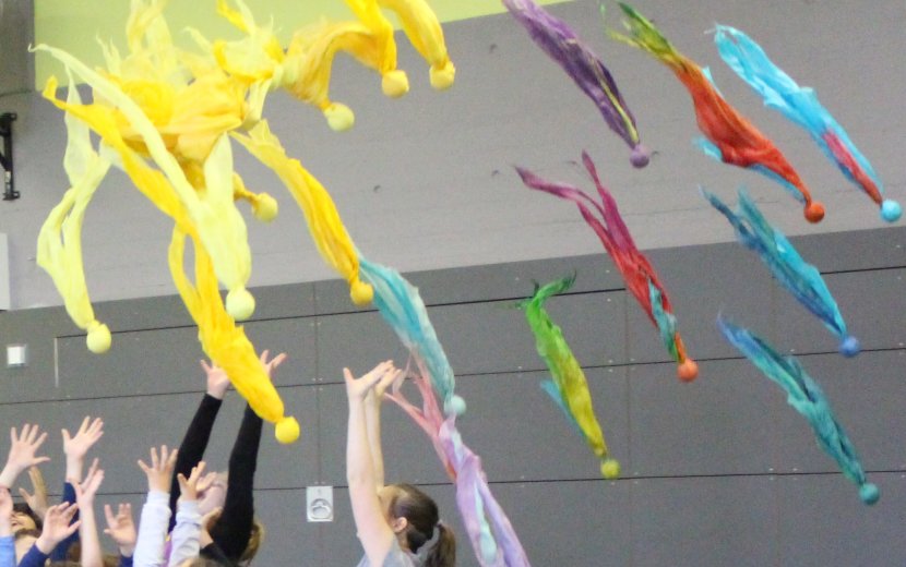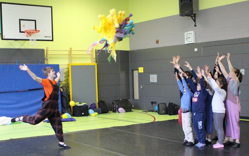 Wortloses, farbenfrohes Wirken: Theater Piano und Schülerinnen und Schüler der Schule am Wolfsbühl bei "Wings of Clown". | Foto: Emily Gasser