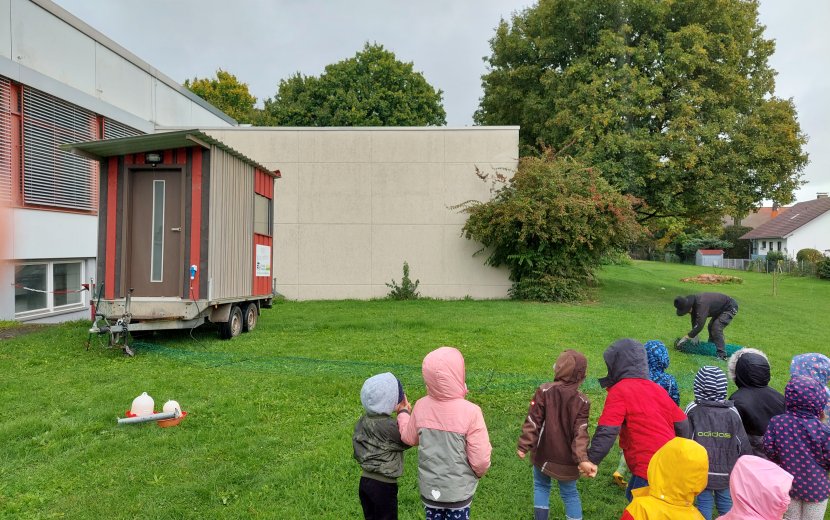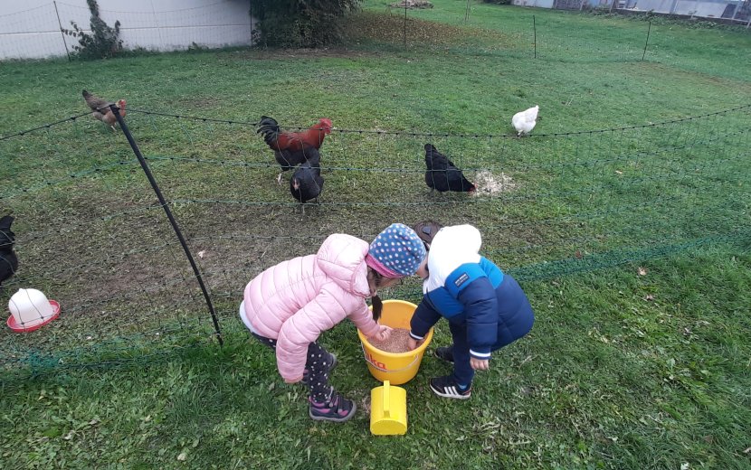 Zu Beginn begrüßten wir Herrn Fink, der uns sechs Hennen und einen Hahn in seinem mobilen Hühnerstall vorbeibrachte. Nachdem er alles eingerichtet hatte, durften wir die Tiere fünf Wochen lang füttern, misten und natürlich regelmäßig die Eier entnehmen. Als die Hühner nach den fünf Wochen wieder abgeholt wurden, flossen bei einigen Kindern tatsächlich Tränen. Was für eine schöne Erfahrung das doch für alle war! Wir bedanken uns ganz, ganz herzlich bei Herrn Fink für sein Vertrauen und seine Mitarbeit, sowie Herrn Wacker für seine Unterstützung bei diesem Projekt!