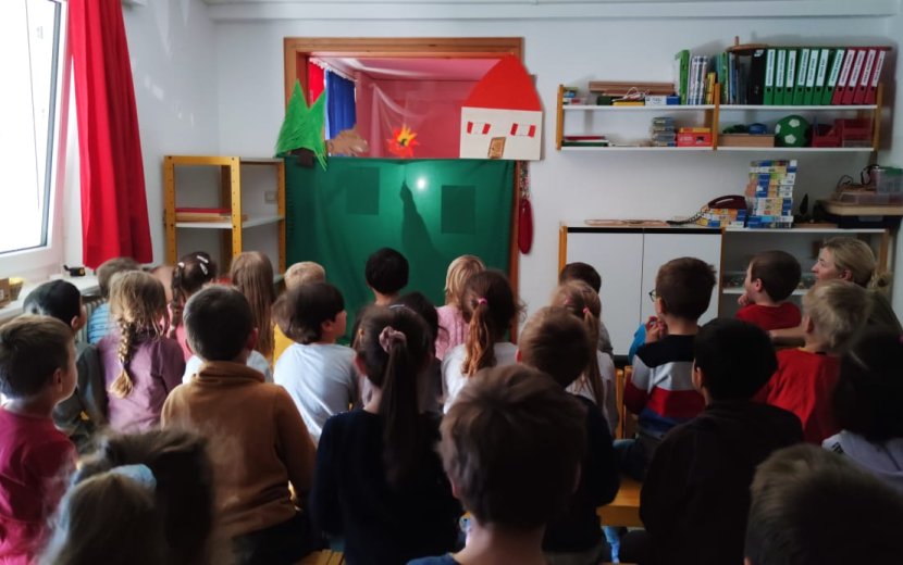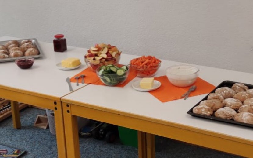 Mit den Eiern haben wir leckere Kürbismuffins und Kürbiskekse gebacken. Ende Oktober feierten wir den gemeinsamen Abschluss mit einem großen Frühstück und Fest. Außer der Butter und der Apfelschorle stand auf dem Buffet ausschließlich Selbstgemachtes der Kinder. Wir haben selber Zwetschgenmarmelade gekocht, Kräuterquark mit Gemüsesticks zubereitet, frische Dinkel-Vollkornweckle gebacken, sowie die restlichen Eier unserer Hühner gekocht und herbstlich eingefärbt. Die Kinder konnten sich gar nicht satt genug essen. Der Stolz des Selbstgemachten sah man in so manchem Kinderauge leuchten. Am Ende verabschiedeten wir die Kinder mit lustigen Kürbisspielen und einem schönen Kasperletheater „der Kürbiskönig“.