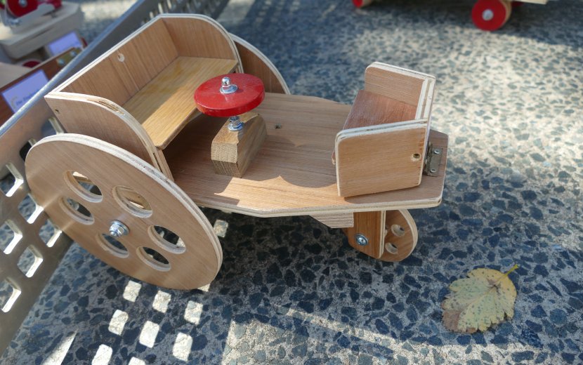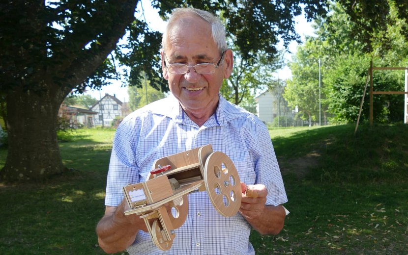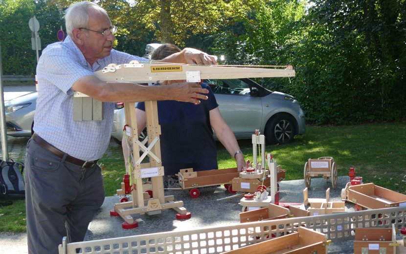Urheber der Freude ist Max Steinhart, Rentner aus dem Kreis Reutlingen, der sein Berufsleben lang selbstständig auf dem Bau tätig war und es sich nun im Ruhestand zum Ziel gesetzt hat, Kindern eine Freude zu machen, die besondere Unterstützung brauchen. Kinderkliniken hat er schon mit seinem komplett selbst gebautem Holzspielzeug beschenkt, ebenso wie Kindergärten oder Einrichtungen der Behindertenhilfe. Wichtig ist ihm dabei das Material. „Heutzutage ist ja alles nur noch aus Plastik,“ beklagt er. Seine Baustellenfahrzeuge sind ganz aus Holz und Metall gefertigt, nur die Seile sind aus Synthetik. „Da geht nix kaputt“, versichert Max Steinhart, „und wenn amol a Schräuble locker wird, na ziehet ihr’s oifach wiedr a!“