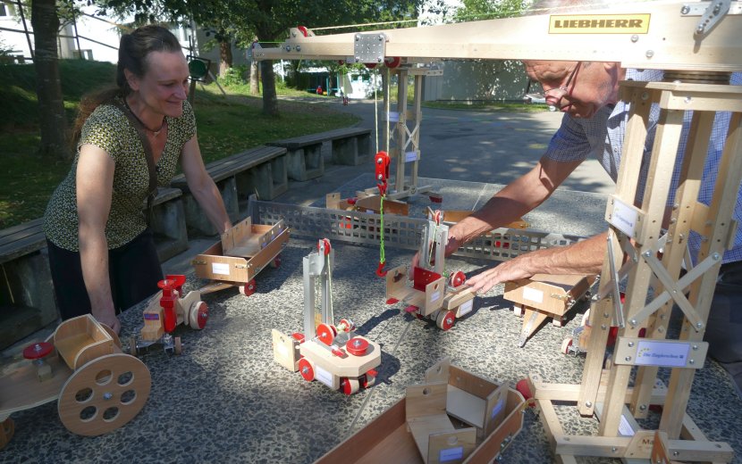 Auch der Schulkindergarten an der Lassbergschule Sigmaringen der Zieglerschen kommt in den Genuss der außergewöhnlichen Spende von „Max, dem Bauarbeiter“, wie Max Steinhart von Bekannten scherzhaft genannt wird. Schulleiterin Alexandra Hoffmann lässt sich bei der Spendenübergabe die Funktionen genau erklären. Sie will die Kinder mit Hör- bzw. Sprachbehinderung, die in ihrem Kindergarten gefördert und betreut werden, erst nach den Sommerferien mit dem einzigartigen Spielzeug überraschen. Sie ist sich sicher: „Da werden die Kinder große Augen machen!“ – dank Max Steinhart.
