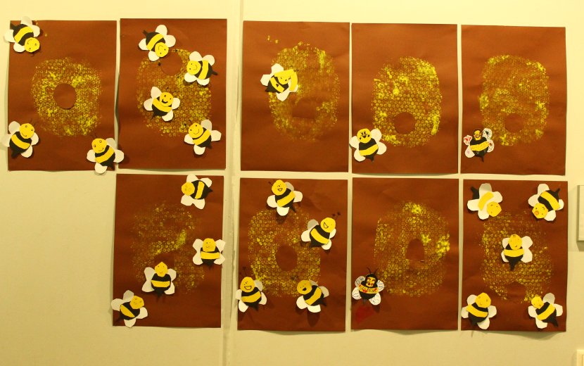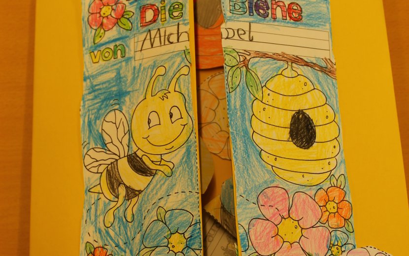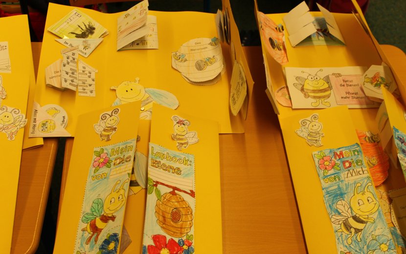 Die Kinder befassten sich in dem Projekt unter anderem mit dem Aussehen und dem Lebenslauf der Biene. Es ging dabei um das Bienenvolk und die Aufgaben im Bienenstock. „Wie macht die Biene eigentlich Honig?“, wollte ein Kind schon gleich zu Beginn wissen. Das erworbene Wissen sammelten die Kinder in individuell gestalteten Lapbooks, welche am Ende den anderen Klassen präsentiert wurden. Und auch im Kunstunterricht hielt das Thema Einzug. Hier wurde mit Luftpolsterfolie und Acrylfarbe ein Bienenstock gedruckt und aus Tonpapier Bienen dazu gebastelt.