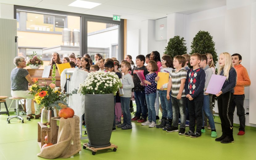 „Wir finden´s richtig cool, unsre renovierte Schul“, sang der Schulchor des Sprachheilzentrums Ravensburg am vergangenen Donnerstag im frisch renovierten Speisesaal. Gefeiert wurde der Abschluss der umfassenden Baumaßnahmen, die aufgrund von strengeren Brandschutzbestimmungen und einem veränderten Raumbedarf nötig geworden waren. Insgesamt 15,9 Millionen Euro waren in der Schule für Kinder mit Schwierigkeiten im Bereich Sprache verbaut worden, etwas über 7 Millionen davon gab das Land Baden-Württemberg. 62 Fachfirmen in 30 Gewerken waren an dem Großprojekt beteiligt, das den gesteckten Kostenrahmen und die Zeitschiene einhalten konnte. „Wir haben hier in die Zukunft der Kinder investiert“, sagte Gottfried Heinzmann, Vorstand der Zieglerschen.
