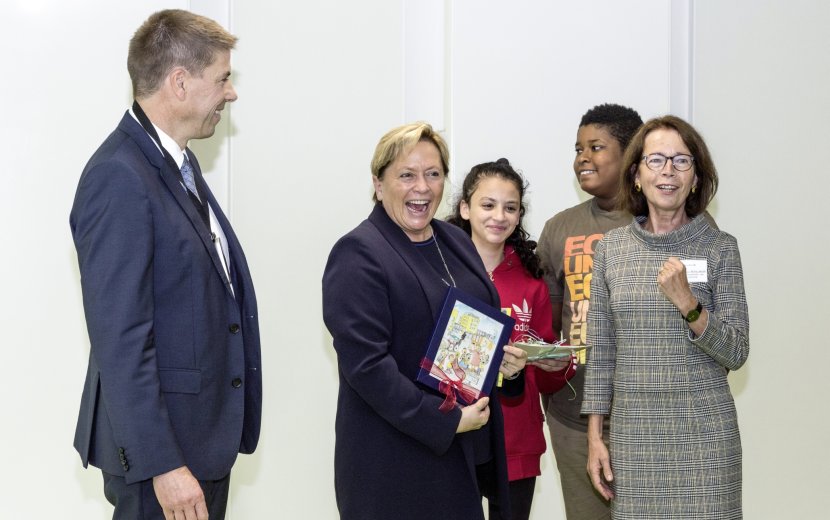 Beim Festakt in der Sprachheilschule Ravensburg hielt Kultusministerin Dr. Susanne Eisenmann (2.v.l.) die Festrede. Vorstand Gottfried Heinzmann (1.v.l.), Geschäftsführerin Ursula Belli-Schillinger (3.v.r.), Schulleiter Christoph Möhrle (2.v.r.) und Geschäftsführer Christoph Arnegger (1.v.r.) und zwei Schüler bedankten sich im Anschluss bei ihr und überreichten Geschenke. | Foto: Stefan Wölke