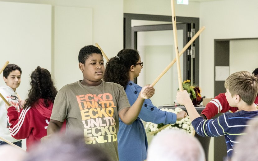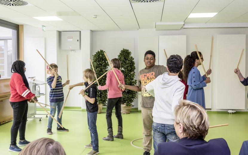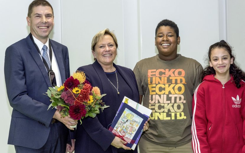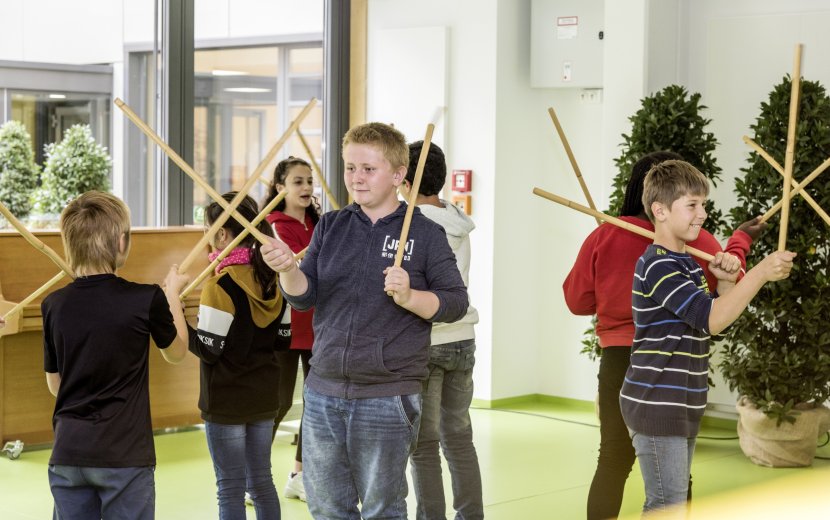 Dass die Kinder sich in ihrer sanierten Schule wohlfühlen, bestätigten nicht nur der Schulchor unter Leitung von Ute Scherf-Clavel und die Stockkampfgruppe unter Leitung von Andreas Güttner. Im Interview mit Geschäftsführerin Ursula Belli-Schillinger äußerten sich auch die Fünftklässler Erik und René begeistert über die Veränderungen in ihrer Schule: 7500 m² neuer Bodenbelag in grün und schwarz, ein Teppich im großen Foyer auf dem man auch „ganz toll Rad schlagen kann“, wie eine Schülerin nach der Veranstaltung begeistert erzählte, dazu neue Stühle in grün, hellbraun und gelb, viele neue Möbel im ganzen Haus, ein Treppenhaus, das den Schall aufnimmt und ganz wichtig: Nahbeschallungsanlagen in den Klassenräumen. „Sprache hat auch mit dem Sprachverstehen zu tun und so war es uns ganz wichtig, hier in Raumakustik und Technik zu investieren“, so Schulleiter Christoph Möhrle. Nun würde man, egal, wo man im Raum stehe, das Gesprochene überall gleich laut und gleich gut hören.