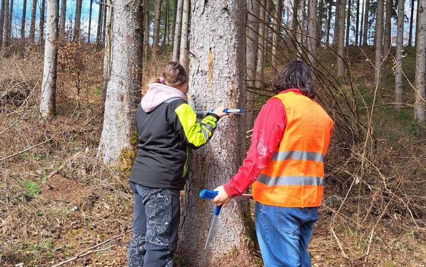 Zum Abschluss bestimmten die Schüler, wieviel Kubikmeter Holz aus einer ca. 40 -50 Jahre alte Fichte verwertetet werden können. Dazu übten die Schüler den Umgang mit der Kemme, das Bestimmen der Baumhöhe über das Försterdreieck. Die Schüler waren motiviert bei der Sache und waren am Ende des Vormittags stolz über die geleistete Arbeit.