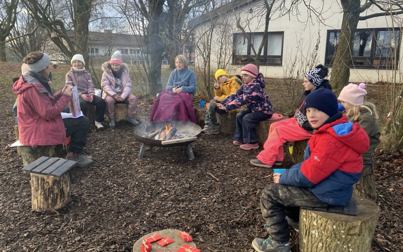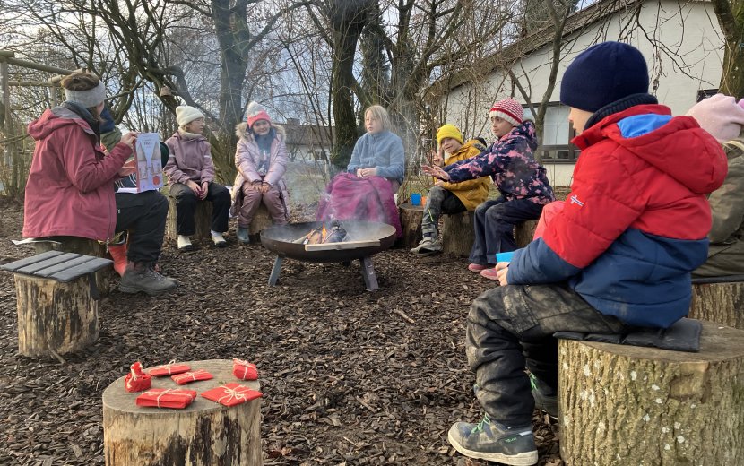 Eine besondere Vorlesestunde während der Projektwoche in der Sprachheilschule Arnach bot die Draußenschule: am Lagerfeuer mit Punsch und Plätzchen! (Foto: Iris Kunzendorf)