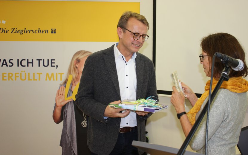 Der Betriebswirt wechselt zum 1. November in das mittelständische, international agierende Unternehmen seines Bruders, das in der Prüftechnik für die Automobilzulieferindustrie tätig ist. Die Anfrage sei für ihn selbst überraschend gekommen, erklärte Gröh. Er stehe heute „mit einem lachenden und einem weinenden Auge hier“, gestand er den vielen Wegbegleitern, die zu seiner Verabschiedung gekommen waren – darunter auch Vertreterinnen und Vertreter des Förderkreises Suchthilfe, der Suchtberatungsstellen, des diakonischen Werks Württemberg und befreundeter Einrichtungen. Gröh dankte in seiner Ansprache dem Aufsichtsrat, dem Vorstand und den Geschäftsführungen der anderen Geschäftsbereiche bei den Zieglerschen. Ebenso hob er die gute Zusammenarbeit mit den Leitungskräften in der Suchthilfe und den Mitarbeiterinnen seines Büros hervor. „Hier für Menschen zu verantwortlich zu sein, wird mir fehlen“, sagte er zum Abschied.