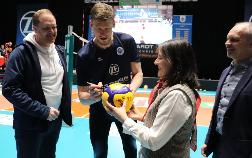 Über spannende Trainingseinblicke, einen handsignierten Volleyball und ein Mannschafts-Trikot, das ebenfalls die Unterschriften der Häfler Volleyballer trägt, freut sich das Leitungsteam der Fachklinik Ringgenhof von der Suchthilfe der Zieglerschen gemeinsam mit Olaf Kohler-Ossinski, dem stellvertretenden Vorsitzenden im Förderkreis Suchthilfe der Zieglerschen.