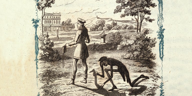 Illustration zu »Peter Schlemihl's wundersame Geschichte« – ein Kupferstich von George Cruikshank aus dem Jahr 1835. Der Stich zeigt den Verkauf des Schattens.