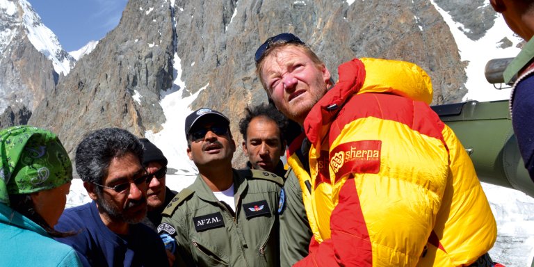 Für diese Aktion wurde er mit einem Helikopter an den Gipfel geflogen, für Thomas Lämmle der bis dahin ungewöhnlichste und nicht weniger gefährliche Aufstieg auf über 8.000 Meter. »Der Flug war brutal«, erzählt er. Eigentlich dachte er, dass dies technisch gar nicht geht. Immer wieder sackte der Helikopter in der dünnen Luft ab. Nach zwei Tagen Suche war klar, dass die drei iranischen Bergsteiger nicht mehr lebten.